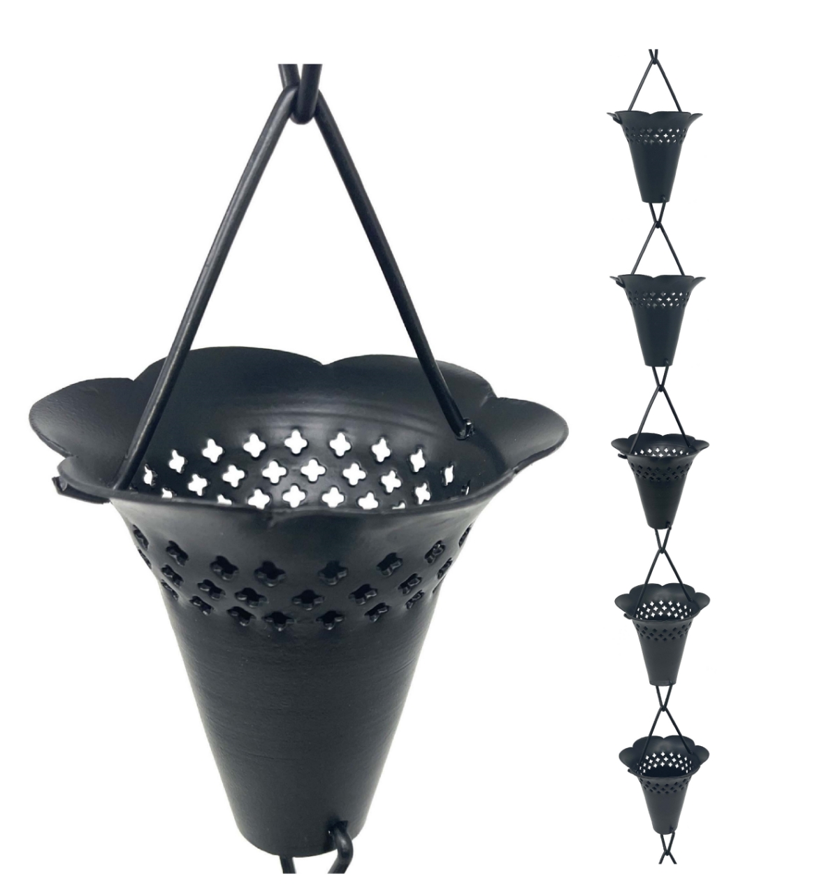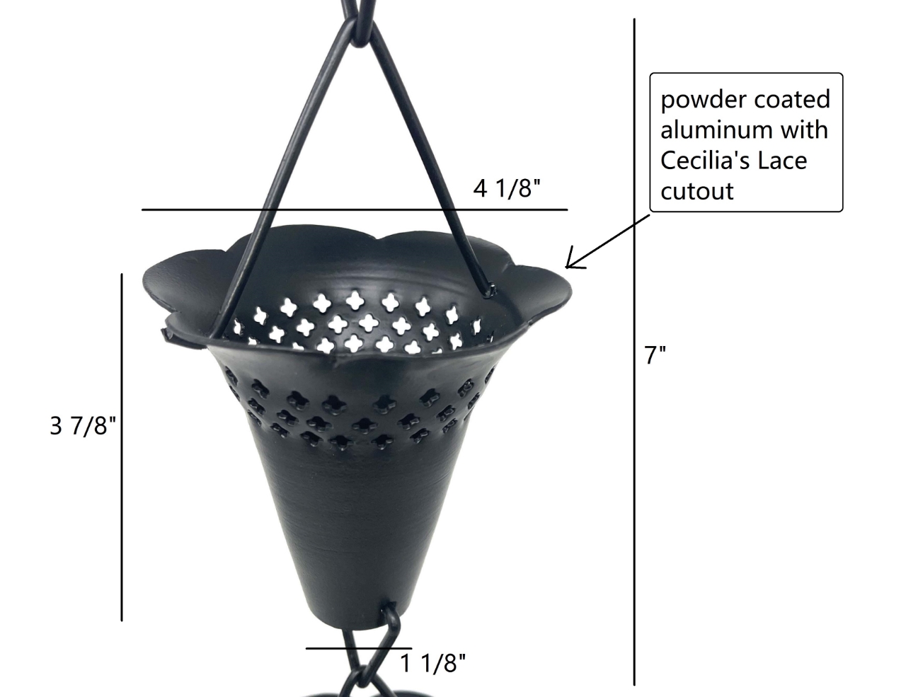Rain Chains look great work great and sound great! No more boring downspouts! Install one of these at your front porch or backyard for added curb appeal. This rain chain features cut-out Cecilia's lace and scalloped cup, black powder coated aluminum, heavy duty material and detail oriented craftsmanship. Imported from India.