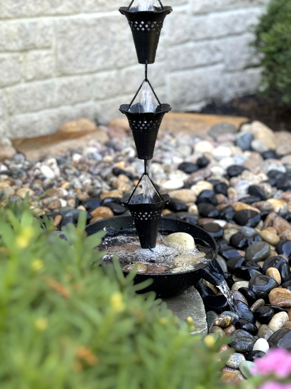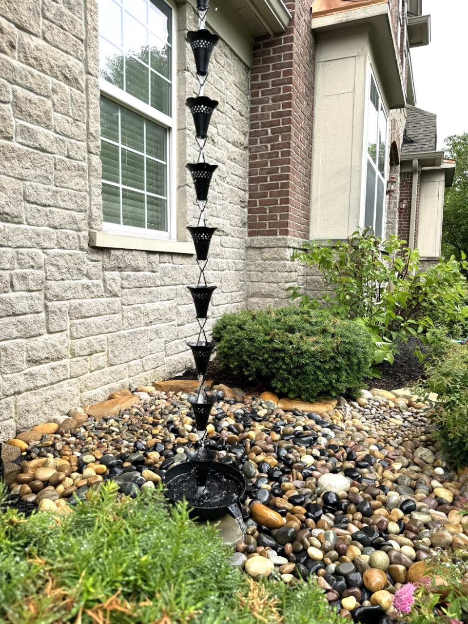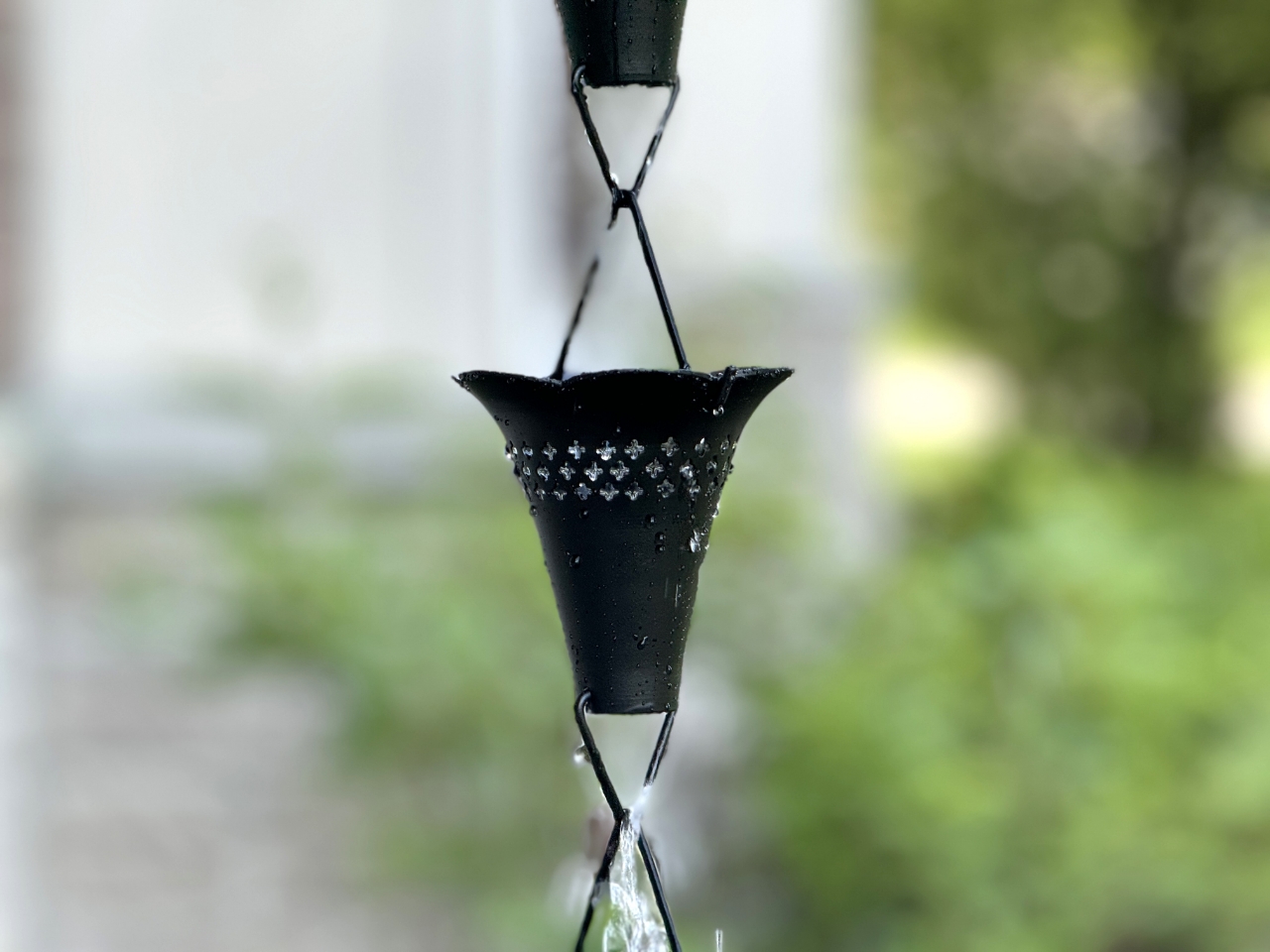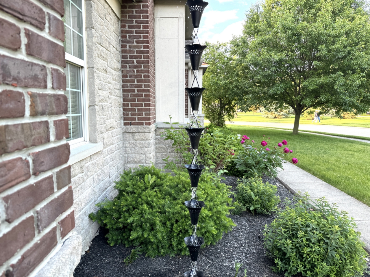 Rain chains are a true delight when it comes to rain! Replace your traditional downspout with this show stopping black powder coated aluminum rain chain that guides the rain water down while creating visible soothing rain sound; use this rain chain as a focal point of your water garden at your favorite corner; 8.5 ft standard length; additional links or cups can be purchased separately here; gutter clip is included for easy DIY installation. This product comes with an extended 3-year warranty.