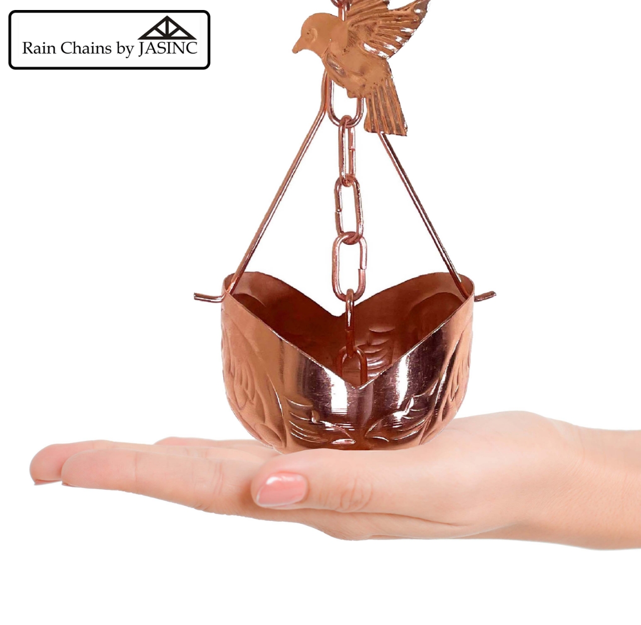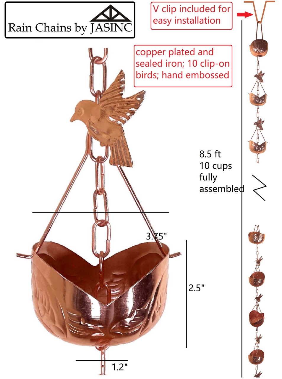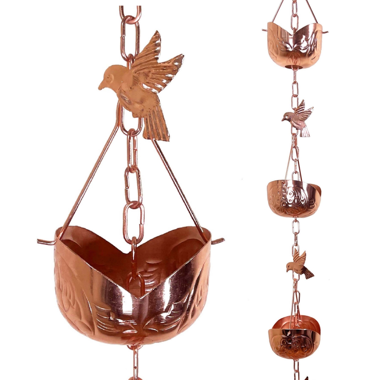 Rain Chains look great work great and sound great! No more boring downspouts! Install one of these at your front porch or backyard for added curb appeal. This rain chain features copper plated iron cup, sealed and rust proof, 10 clip-on birds, heavy duty material and detail oriented craftsmanship. Imported from India.