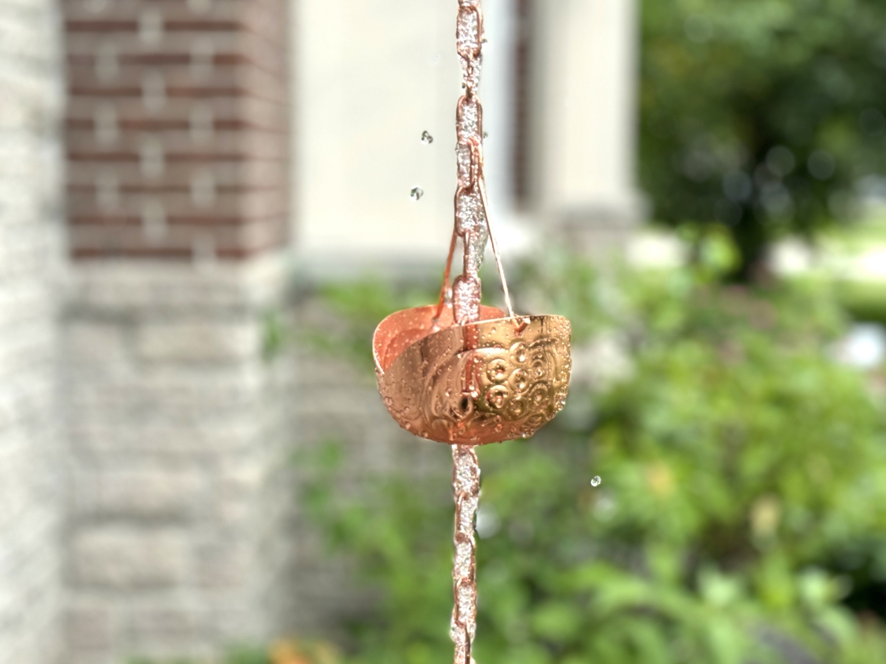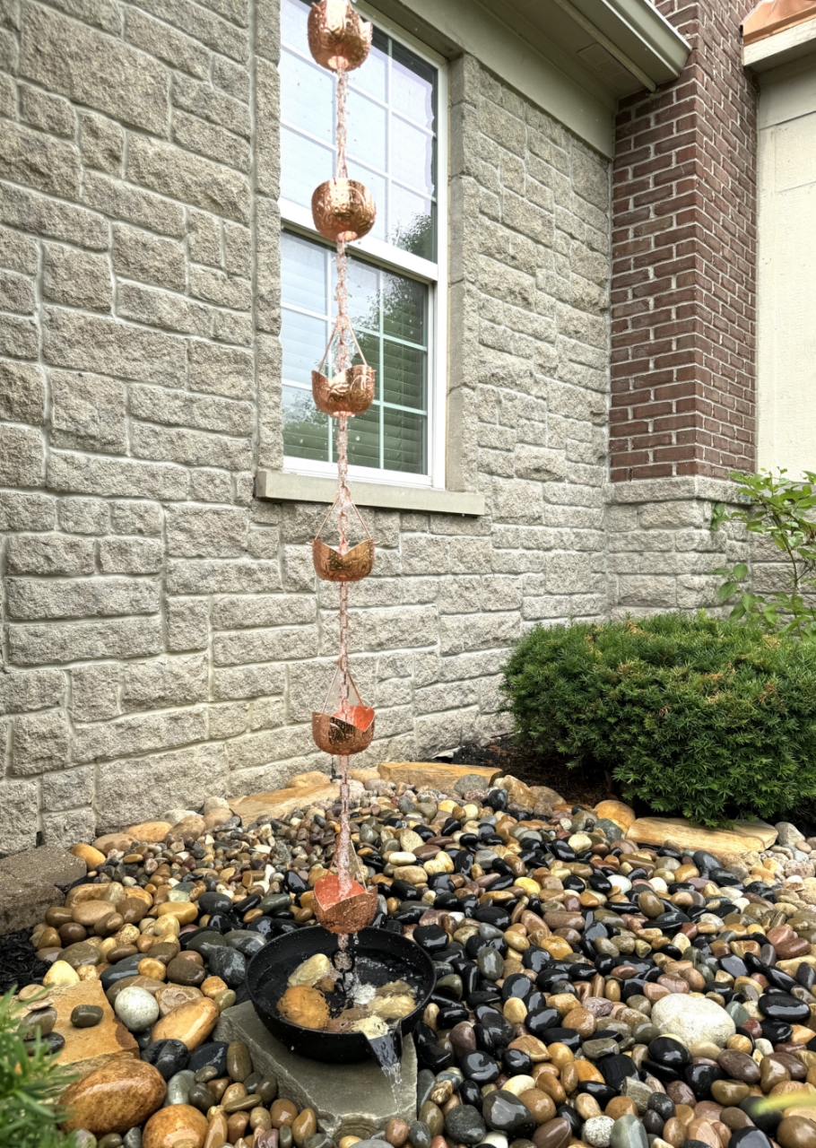 Rain chains are a true delight when it comes to rain! Replace your traditional downspout with this show stopping copper plated rain chain that guides the rain water down while creating visible soothing rain sound; use this rain chain as a focal point of your water garden at your favorite corner; 8.5 ft standard length; additional links or cups can be purchased separately here; gutter clip is included for easy DIY installation. This product comes with an extended 3-year warranty.