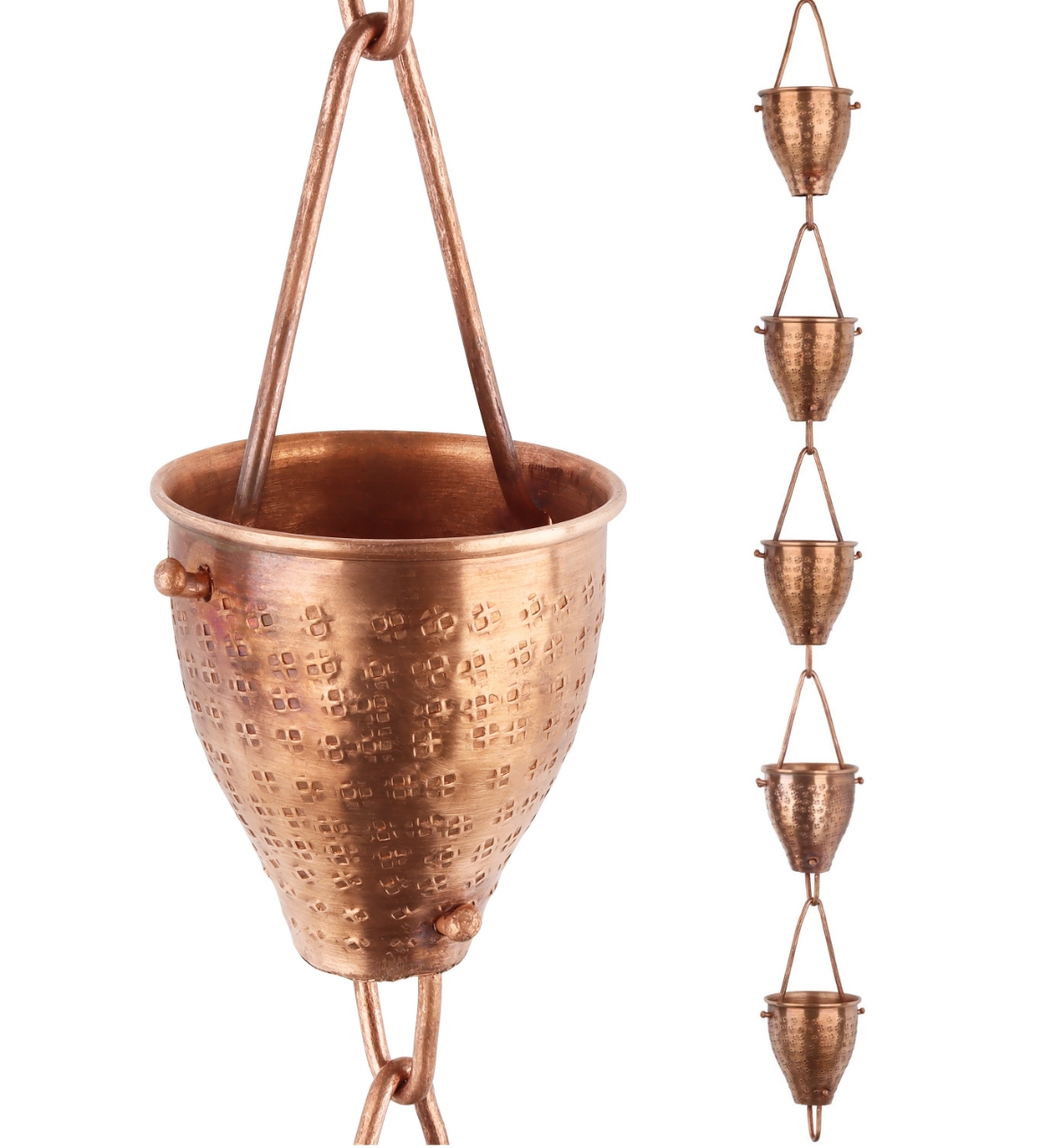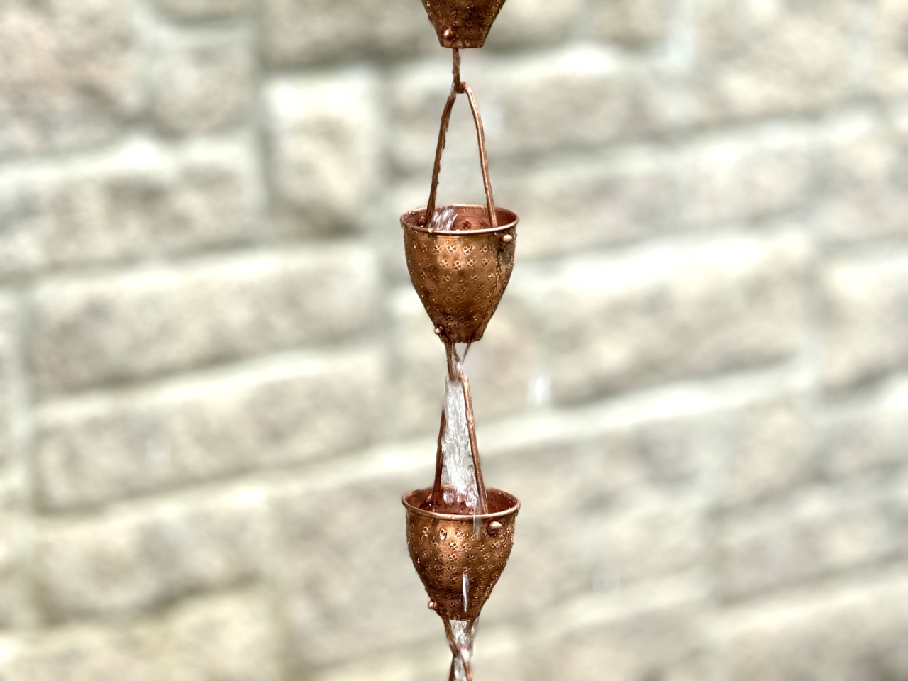 Rain Chains look great work great and sound great! No more boring downspouts! Install one of these at your front porch or backyard for added curb appeal. This rain chain features copper stamped cups, heavy duty material and detail oriented craftsmanship. Imported from India.