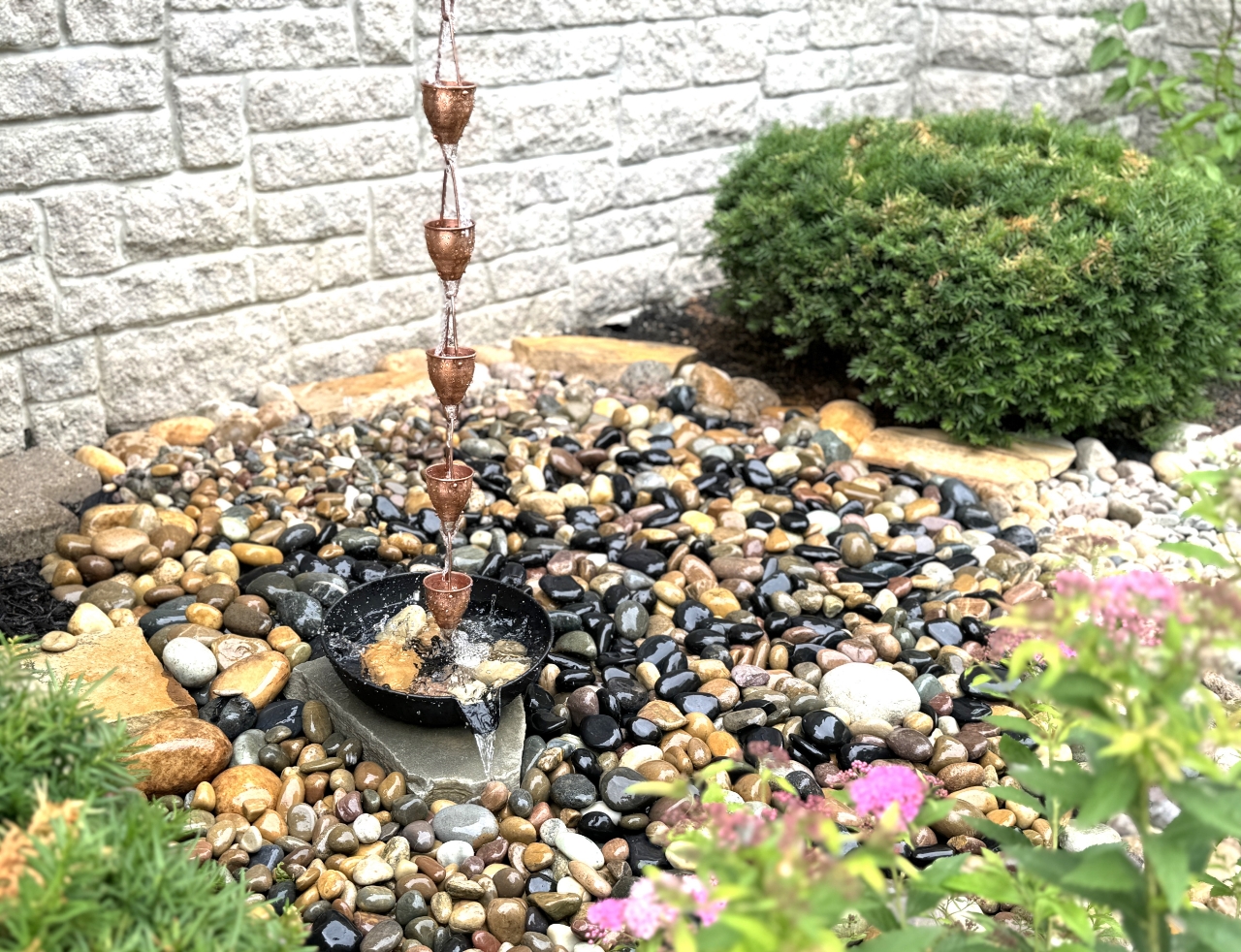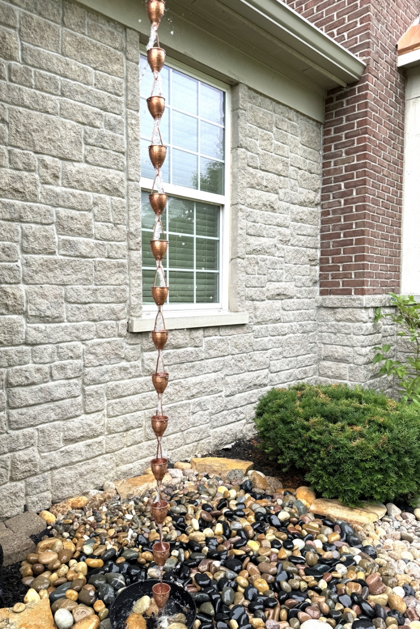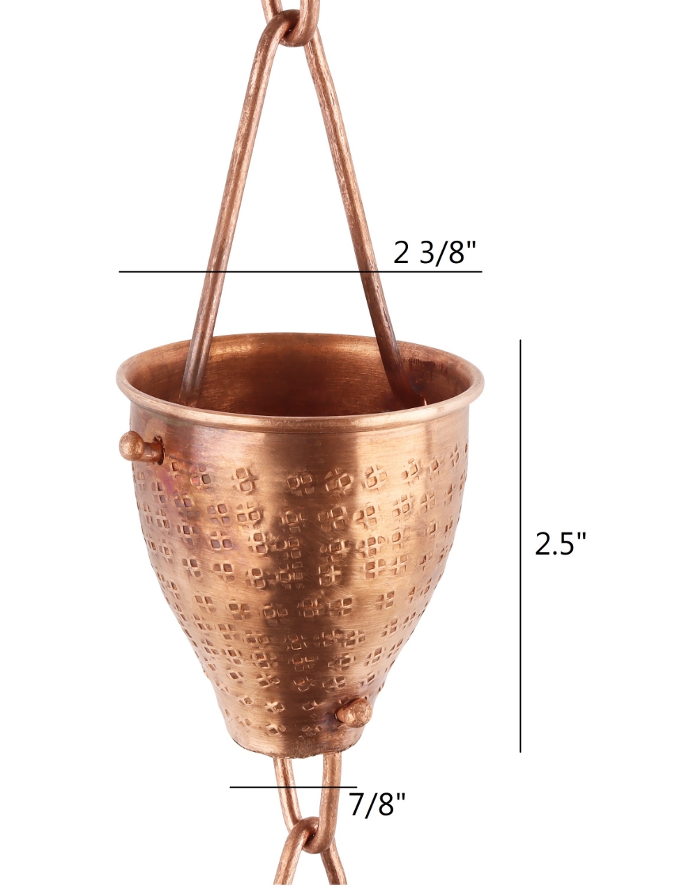 Rain chains are a true delight when it comes to rain! Replace your traditional downspout with this show stopping copper rain chain that guides the rain water down while creating visible soothing rain sound; use this rain chain as a focal point of your water garden at your favorite corner; 8.5 ft standard length; additional links or cups can be purchased separately here; gutter clip is included for easy DIY installation. This product comes with an extended 3-year warranty.