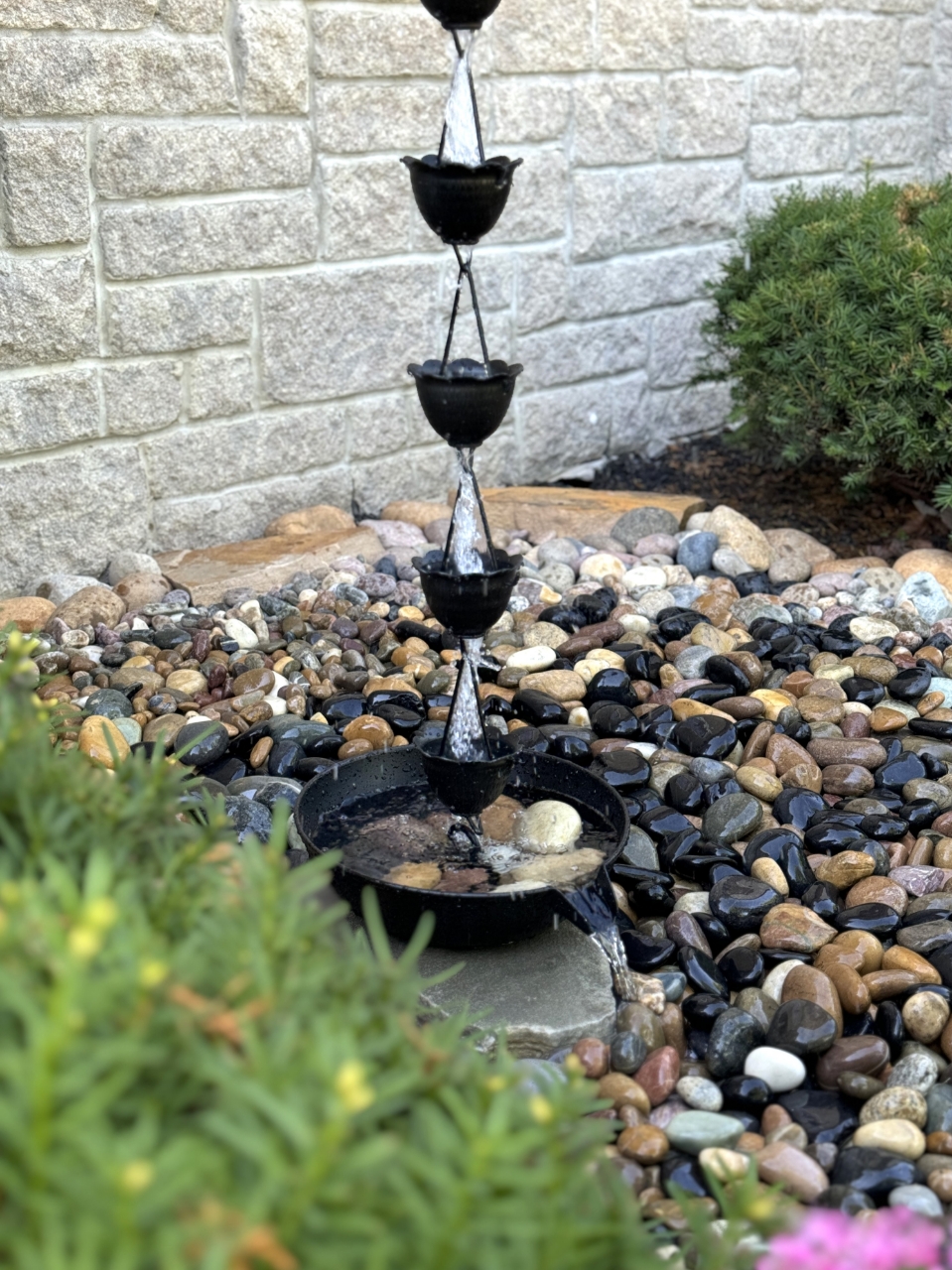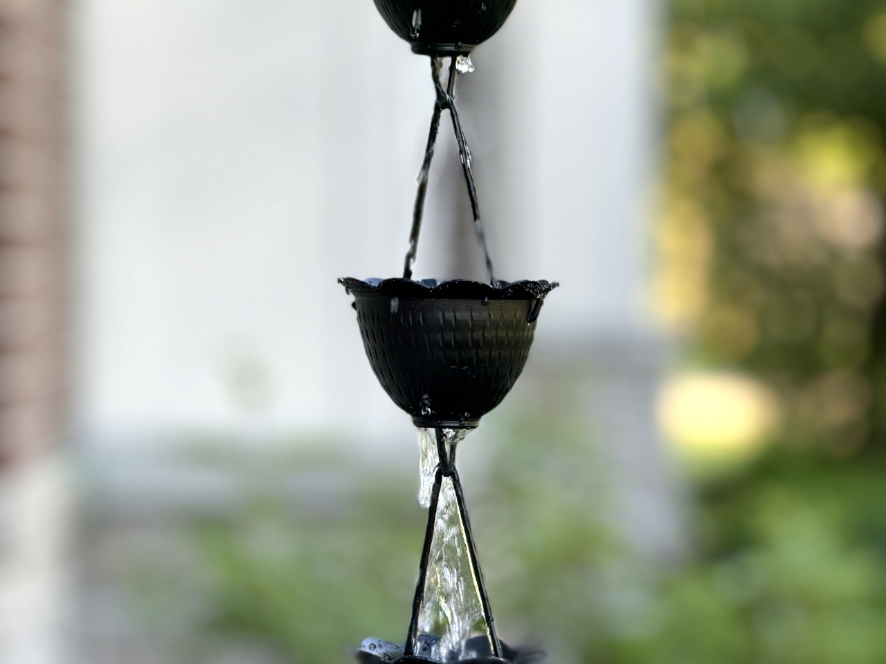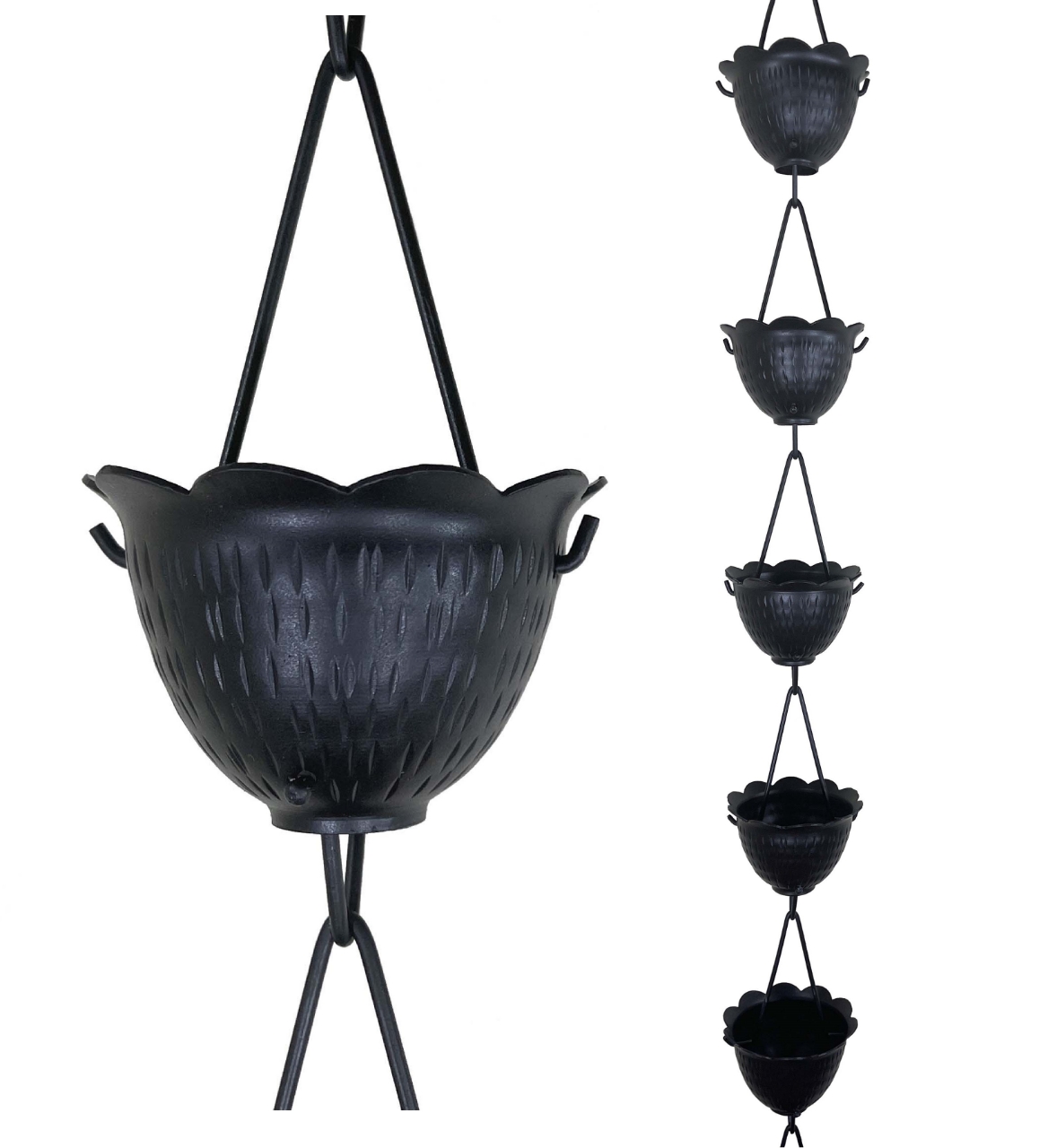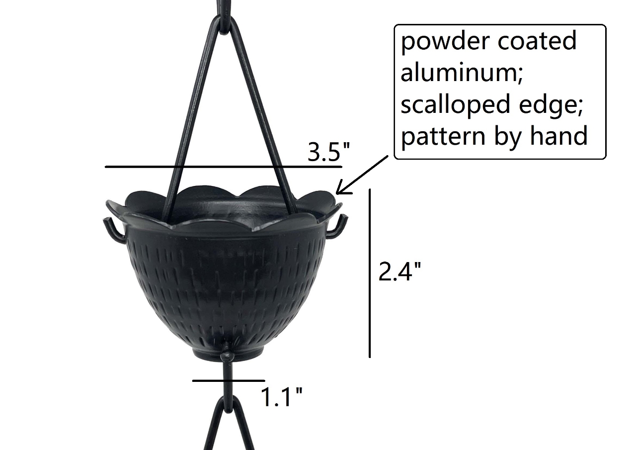 Rain chains are a true delight when it comes to rain! Replace your traditional downspout with this show stopping black powder coated aluminum rain chain that guides the rain water down while creating visible soothing rain sound; use this rain chain as a focal point of your water garden at your favorite corner; 8.5 ft standard length; additional links or cups can be purchased separately here; gutter clip is included for easy DIY installation. This product comes with an extended 3-year warranty.